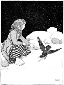 SUDDENLY A LARGE RAVEN HOPPED UPON THE SNOW IN FRONT OF HER
