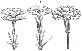 calyx assuming the form and colour of a monopetal; but the stamens sometimes become detached petals, within an encircling or duly formed monopetal. and thus present a somewhat analogous aspect to that of the double rose, as in the case of the double[1] polyanthus, which has at the same time a perfect calyx. In other cases, as in that of the double Canterbury bell, the double pip occurs sometimes by the formation of an additional pip from the growth that should have produced stamens; the calyx, like that of the double polyanthus, being formed in the usual manner. In this case the flowers are liable to be entirely barren, though a few of the flowers, having still some of the seed producing stamens, and the pistil more or less perfect, produce seeds; many of which, however, never germinate. (See cut 4).