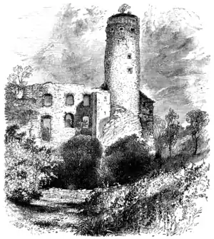 the destruction of the castle was resolved on before its evacuation by the garrison. With the intention of blowing up the whole upper rock, barrels of powder were placed in the cisterns, and covered with stones. The mine exploded before it was ready with prodigious noise and killing nine-and-twenty men, but with only partial damage to the castle. However the work of destruction was furthered in 1819 by a stroke of lightning, which shattered the roof of the tower, and placed the castle much in the condition in which it is now to be seen. It is never likely to be used again as a fortress in these days of long-range artillery, commanded as it is on every side by hills. After all its vicissitudes of fortune and changes of masters, Königstein is one of the grandest ruins in Germany, especially when viewed from the south-east, dark against the sunset.