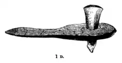 Considerable discussion has arisen respecting the modes by which the celts were affixed to their handles. The celt of the simple form was probably (Fig. 1 c) inserted into a wooden haft, as in the example given of the stone implement (No. 1 d).