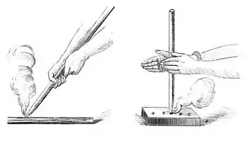 Fig. 1.—The Stick-and-Groove. (Tylor.) | Fig. 2. The Fire-Drill. (Tylor.) |