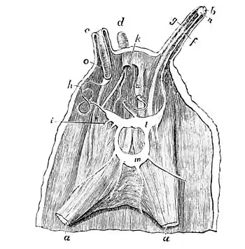 The brain of the snail is connected, by means of a triple cord or commissure on each side of the œsophagus, with a still longer double ganglionic mass (m). This latter body, situated beneath the œsophagus, represents the pair of pedal and the pair of branchial ganglia of the bivalve Mollusca. Here nerves are received from the integument and given off to the muscles of the foot, while they are also received and given off from the respiratory and other organs.