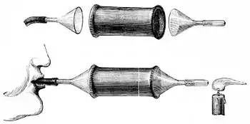 vided the mortar is permeable to air. It has as yet no effect on the flame of this candle, because its velocity is not great enough. But if I fix a funnel on the other end of the cylinder, the air which has passed through the mortar can only escape through its narrow end, and there you see the flame sensibly deviating. You may even succeed in extinguishing it altogether. The velocity of the air in going through the tube must increase in proportion as the transverse section of the