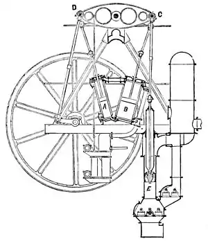 In this engine the lower ends, A, B, of the two cylinders are brought close together under the centre of the beam, thus shortening