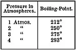 1. It is well known that the boiling-point of water rises as the pressure increases. This is shown in the adjoining table. 2. It follows from the above that if water be under strong pressure, and at high temperature, though below its boiling-point for that pressure, and the pressure be diminished sufficiently, it will immediately flash into steam. 3. Water heated beneath, if the circulation be unimpeded, is very nearly the same temperature throughout. That it is never the same temperature precisely is shown by the circulation itself, which is caused by difference of temperature, producing difference in density. The phenomenon of simmering is also a well-known evidence of this difference of temperature, since it is produced by the collapse of steam-bubbles rising into the cooler water above. 4. But if the circulation be impeded, as when the water is contained in long, narrow, irregular tubes, and heated with great rapidity, the temperature may be greater below than above to any extent, and the boiling-point may be reached in the lower part of the tube, while it is far from this point in the upper part.