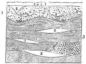 Fig. 1.—Scale twelve feet to one inch. 1. Sandy clay, or "trail." with patches of sand (S) and scattered flints, mostly in nests, at the irregular base of the deposit. 3. Sands and gravel, false-bedded with lenticular beds of sand (S), and in the lowest seams rounded pebbles of chalk.