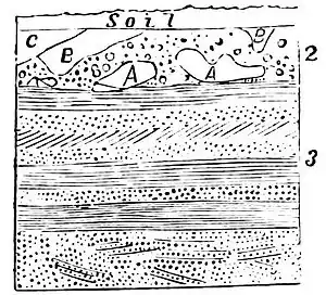 It generally, if not always, rests upon an irregular surface of the beds below it, and contains stones derived from some other source.