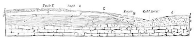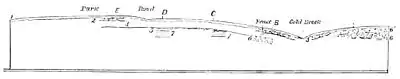 Fig. 3.—Theoretical Section according to Prof.Preswich: 2. Surface gravels. 3. Brick, earth, and gravel, with flint implements, mammalian remains, and land and fresh-water shells. 3. Peaty bed,with wood and land and fresh-water shells. 4. Bowlder-clay. 5. Sands and gravels. 6. Chalk, probably.