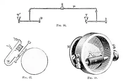 A novel and purely mechanical telephone is illustrated by Fig. 26. In place of a line-wire, the illuminating gas, contained in gas-pipes, is used. It is calculated for short distances only, as it is essential that