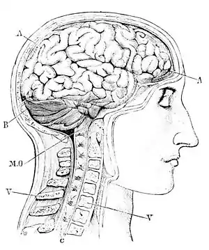 Fig. 1.—Side View of the Brain and Spinal Cord.—(From Bourgery.) A, the cerebrum; B, the cerebellum; M.O, the medulla oblongata; V, the vertebræ, cut in halves; C, the spinal cord, and the origin of its nerves.