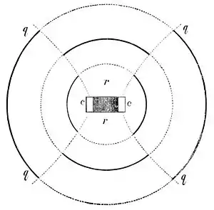 Now what must happen along these dotted lines, or, rather, surfaces? Evidently there is a struggle here between the condensations and the rarefactions. The former tend to make the molecules of air go nearer together, the latter try to separate them; but, as these actions are equal, and as the air is pulled in opposite directions at the same time, it remains at rest—does not vibrate. Therefore, along the surfaces q, q, q, q, there is silence. When the prongs vibrate toward each other they make the reverse actions on the air; that is, rarefactions are now sent out from c and c, while condensations are sent from r and r, but the same effect of silence along q, q, q, q, is produced.