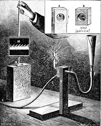 Experiments by which Compound Sounds are analyzed by viewing in a Rotating Mirror the Vibrations of König's Manometric Flames.—Take a piece of pine board. A, Fig. 51, 1 inch (25 millimetres)