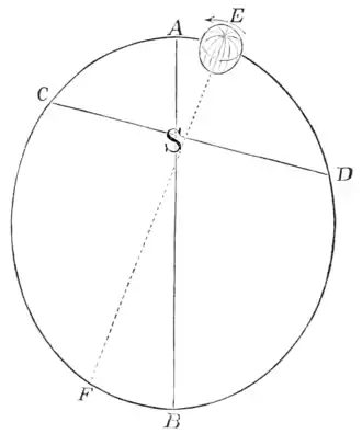 I have here drawn a diagram illustrating the present position of the earth's orbit with respect to the line of the apsides, purposely exaggerating the eccentricity of the ellipse in order to better present it to the eye of the observer. In the diagram, A B is the line of the