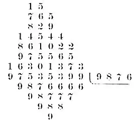 In this work the divisor is placed next below the dividend, and removed one place to the right since it is not contained in the first four figures of the dividend. The process with the first figure of the quotient, placed as usual at present, is as follows: The first number of the divisor, 9, is contained in 97 nine times with a remainder 16. The first figure of the divisor having been used is canceled; as are also the first two figures of the dividend. (The "scratches" or canceling-marks are omitted in the illustration.) The remainder, being of the same denomination as the first two figures of the dividend, is put directly above them. The next number to be used is 165. Multiplying the second figure of the divisor, 8, by 9, and subtracting from 165, 93 remains; 165 and 8 are now canceled, having been used. The remainder 93 is placed above in the proper orders, the 6th and 7th places. So it continues, leaving, after completing the work with the first figure of the quotient, the remainder 8651399. The divisor is now set down again, taking one place to the right as it should to correspond to the highest order now in the dividend: the last figure being raised to the line above, probably for symmetry. The process is continued as before.
