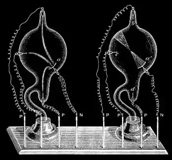 tions. I will now try the same experiment with a bulb (B) that is very highly exhausted, and, as before, will make the side pole (a') the negative, the top pole (b) being positive. Notice how widely different is the appearance from that shown by the last bulb. The negative pole is in the form of a shallow cnp. The molecular rays from the