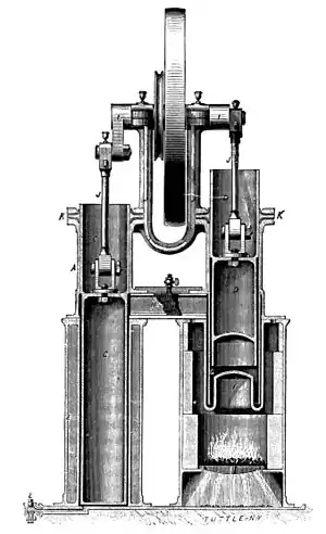 nearly to its extreme upper position. The air in contact with the water-jacket becoming cooled contracts, and the pressure is reduced below the power-piston, which then descends by the force of the atmosphere. As it reaches the end of its downward stroke and begins