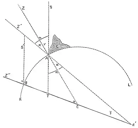 A Z, but is deflected toward the mountain, so that it gives the direction A Z' as the apparent vertical, and Z' as the apparent zenith. On this account, the zenith-distance of the star is increased by the angle a, to a degree that is represented by the angle m. The prolonged plumb-lines B Z" and A Z' consequently do not form the angle x at the center of the earth, but another angle, y, which differs from x by the magnitude a, wherefore, a x y. If, now, we imagine the line of direction A S prolonged backward, an equivalent of the angle u is formed at T, and by the lines A C' and A T the angle m, equal to the observed zenith-distance at A. But u being the external angle of a triangle, m y, or y m—u; and since a is equal to x y, if we substitute for y the difference m u, a x u m. The angles u and m have been obtained by observation as zenith-distances of the fixed star S S', and we have only to obtain the value of the angle x, which is deduced from a trigonometrical measurement of the arc A B. The mass of the