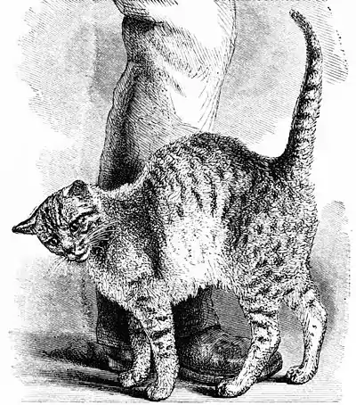 "Let us now look at a cat in a directly opposite frame of mind, while feeling affectionate and caressing her master; and mark how opposite is her attitude in every respect. She now stands upright, with her back slightly arched, which makes the hair appear rather rough, but it does not bristle; her tail, instead of being extended and lashed from side to side, is held quite stiff and perpendicularly upward; her