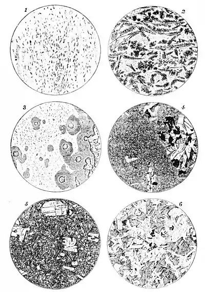 Fig. 1.—Sections of Igneous Rocks, illustrating the Passage from the Glassy to the Crystalline Structure. 1. Vitreous rock. 2. Semi-vitreous rock. S. Vitreous rock with spherulites. 4. Rock with cryptocrystalline base. 5. Rock with microcrystalline base. 6. Rock of granitic structure built up entirely of crystals.