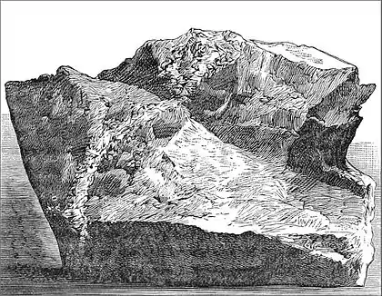 Fig. 1.—Block of Diorite from the Pic-du-Midi, showing on its Surface a Melted and Vitrified Track produced by the Passage of Lightning. (From a specimen in the Museum; figure one fourth the natural size.00)