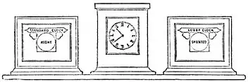 The standard clock is an astronomical regulator with mercurial pendulum and dead-beat escapement, and closes an electric circuit at the sixtieth second of each hour. Another regulator, technically called "Lobby," is for use in case of accident to "Standard." They are so connected that a single failure of "Standard" to send out a signal at the proper time brings "Lobby" into action for the next signal, and, in order that "Lobby" may always be ready for service, an intentional breakdown of "Standard" occurs automatically at eight each morning, and the nine o'clock signal is sent out by "Lobby"; which of the two is in operation is shown by indicators connected with the clocks (Fig. 10).[1] Should a breakdown occur, the indicator of "Standard" would show missed, and that of "Lobby" at work.