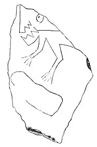 Among the most interesting remains of any race of people, are the rude beginnings of art they have left behind them; and, though the people under consideration did not have, as far as we know, any written language, they have left a few memorials of their artistic feelings in the shape of some carvings on bone, and a few inscribed stones. The most interesting of these are here figured. Fig. 20 represents, on a piece of limestone, the head and forelegs of some curious animal. What is meant is hard to imagine. The teeth are marvelous, but still, in their arrangement, are like the teeth of the wolf-pipe in Fig. 19. Fig. 21 is a portion of a bone having peculiar marks cut on it. The marks are the same on