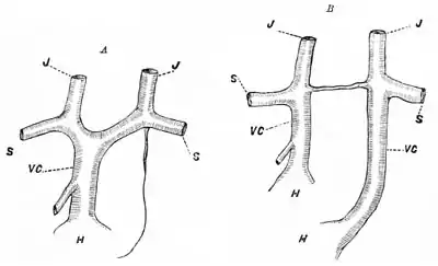 Fig. 8.—A, Normal Arrangement; B, Abnormal Arrangement. J. J., jugular veins from head; S. S., subclavian veins from arms; V. C, vena cava; H, heart.