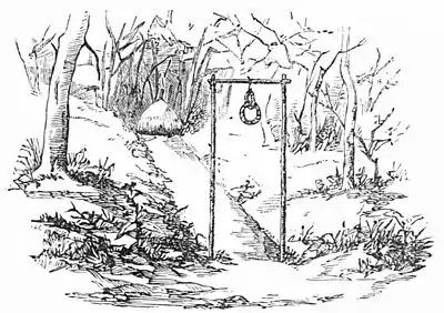 Sometimes the graves contain nothing but the hair and nails of the persons to whom they are erected; for the man may have died on a journey, and have been buried among strangers. But, in order that a place may be provided near his home where his spirit may linger, and enjoy the food and drink that are regularly brought to it, one of his friends will cut off some of his hair and nails, and present them to the family to be formally buried as a symbol of the whole body, which it is not convenient to remove. The little relics are then mourned over and buried just as if they were the body itself, which is, however, moldering far away. Such a monument was the pile of wood which I found near Malansh, a copy of my drawing of which is given in Fig. 5. It may, however, be a hunter's medicine, for that was one among the explanations that were given me of its purpose. Four rough-hewed tree-trunks served as posts to hold up the structure of logs and limbs and straw. In front of the structure was a carved idol, on both