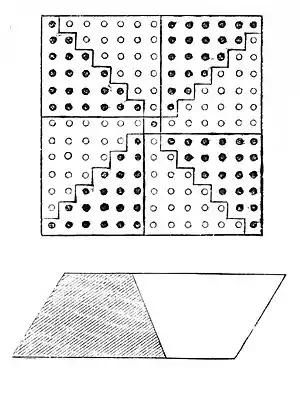 Fig. 4. essential condition of such a number, that the octuple of a triangular number, augmented by unity, is a perfect square. This fact is made evident by the examination of the diagram (Fig. 3). An arithmetical progression is a series of numbers in which each member is equal to the preceding member, plus a constant number which is denominated the common difference. Thus the odd numbers one, three, five, seven, nine, eleven, form an arithmetical progression, the common difference of which is two. We can demonstrate, as was done in the preceding case, that the sum of the terms in such a procession is equal to the product of the number of terms by the half-sum of the extremes; and, in the same way, the area of a trapeze is half the area of a parallelogram of the same height, the base Fig. 5 The Square of Cabbages. of which is equal to the sum of the bases of the trapeze (Fig. 4).