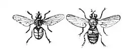 Fig. 9.—Cone-fly (Rhingia rostrata), natural size. Fig. 10.—Eristalis arbustorum, natural size. consists of a suctorial proboscis, resembling in a general way that of the common house-fly. It is tubular, short and thickened at its extremity, so as to form a disk, upon which are furrows and hairs. It is by means of this disk that the honey is taken up. The proboscis of the Diptera being almost always short and blunt, they can only extract honey from such flowers as have an open corolla. Insects of this order, then, need only be sought for on flat flowers, and there indeed they may be seen on any sunny day, rapidly creeping about, and greedily imbibing the nectar. The Umbelliferæ are special favorites with them, the nectar being found on the disk in the center of the flower, which can very easily be reached. The Diptera are never found on flowers with long corolla-tubes. Only such forms as the humble-bee flies, Syrphidæ, Empidæ, and a few others, have a proboscis large enough to enable them to obtain honey from flowers of slightly tubular form. The proboscis of Bombylius (Fig. 11, I) is about one centimetre long. It is strong and stiff, cleft at the extremity, B, and thickly beset with