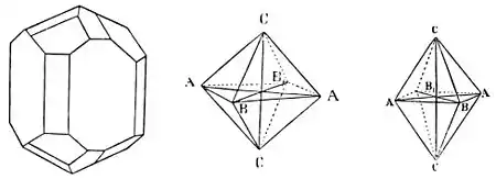 of native silver as found in Konigsberg, Norway; and, finally (Fig. 7), a crystal of cassiterite (tin-ore) from Cornwall, in England, which has also been discovered in this country in the Black Hills, Dakota Territory. There are seven systems of crystallization, differing in the relative magnitudes and directions of certain lines of symmetry, termed the axes of the crystal. In the first, second, and third systems, these lines bear the same inclination to one another, but their magnitudes are respectively equal in the first system (see Fig. 8) (here A A', B B',