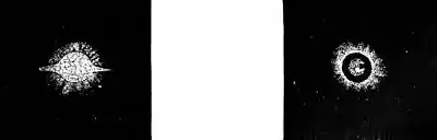 a sharp edge. Figs. 16 and 17 exhibit the most striking of these very remarkable stellar nebulæ: the first is surrounded by a system of rings like Saturn, with the thin edge turned toward us; the second is a veritable star of the eighth magnitude, and is not nebulous, but is surrounded by a bright luminous atmosphere perfectly concentric. To the right of the star is a small dark space, such as often occurs in these nebulæ, indicating, perhaps, an opening in the surrounding atmosphere.