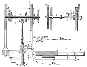 It revolves with the vertical shaft, and travels over a disk (D) pierced with as many holes as there are letters on the type-wheel, these holes being ranged in a circle round the base of the shaft, and at such a distance from the shaft that the extremity of the chariot passes exactly over them. In these holes are the upper ends of a set of pins (g), which are raised by putting down a set of keys (B N) resembling those of a piano. When the chariot passes over a pin which is thus raised, the piece v is lifted away from v', and the current from the battery, which previously passed from the pin through v and v' to the earth, is now cut off from v', and passes through v to the electro-magnet, and thence to the line-wire.
