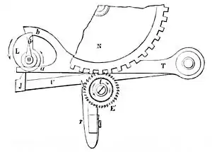 the impression, raises the arm (J U), which carries a spring (r) with a click at its extremity. This click, in its ascent, glides over the teeth of the ratchet-wheel (E), but locks into the teeth and turns the wheel in its descent, and, by so doing, advances the paper through the distance corresponding to one letter. The spacing of the words is obtained by the help of the blank on the type-wheel.