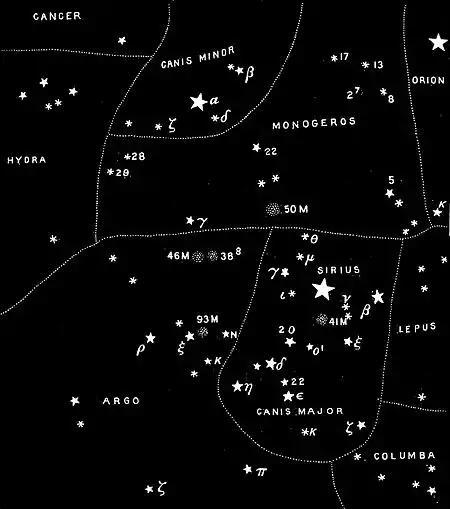 Look next at the little group of three stars forming the head of Orion. Although there is no nebula here, yet these stars, as seen with the naked eye, have a remarkably nebulous look, and Ptolemy regarded the group as a nebulous star. The largest star is called Lambda (λ); the others are Phi (φ) one and two. An opera-glass will show another star above λ, and a fifth star below φ2 which is the farthest of the two Phis from Lambda. It will also reveal a faint twinkling between λ and φ1. A field-glass shows that this twinkling is produced by a pretty little row of three stars of the eighth and ninth magnitudes.