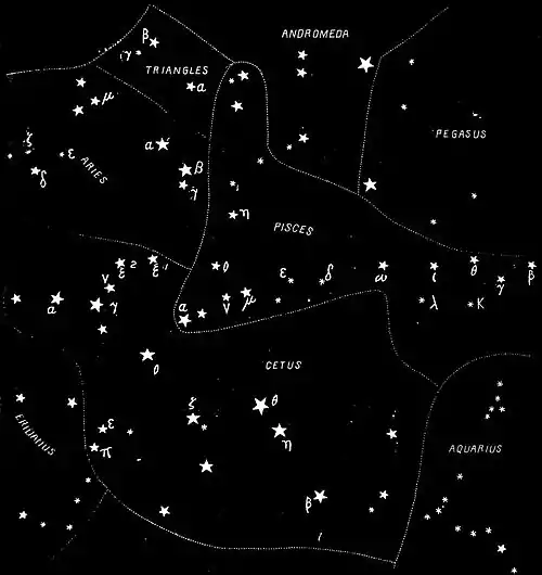 then begins to fade again, and, in about three months, once more disappears. There are various irregularities in its changes, which render its exact period somewhat uncertain, and it does not always attain the same degree of brightness at its maximum. For instance, in 1779, Mira was almost equal in brilliancy to a first-magnitude star, but frequently at its greatest brightness it is hardly equal to an ordinary star of the second magnitude. Mira will attain its greatest brilliancy about the 2d of November, this year. By the aid of our little map you will readily be able to find it. You will perceive that it has a