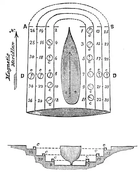 would point to the north, at every station. But an iron ship is there: so at station 1 we find the north end of the needle repelled from the vessel; the same occurs at stations 3, 4, 16, and many others from bow to keel around the forward body of the ship. Now, only north magnetism can produce this kind of deflection: it varies in degree at each station, and where greatest there is its pole. Again: at stations 7, 8, 9, etc., we find the needle's north end attracted toward the ship; hence we have discovered the body of