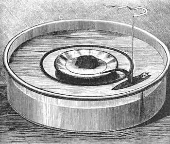 M. Devaux has exemplified the strength and persistence of the tensional force by connecting his camphor-boat with a float in the shape of a watch-glass. The movement of the boat continues, carrying