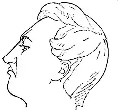 former push the lower lip upward and the corners of the mouth are depressed, the red edge of the lower lip is turned outward. Under the influence of the levator muscles of the chin, wrinkles characteristic of the lower lip are formed in the expression of Fig. 15.—Contemptuous Expression in the Mouth. contempt as well as in that of stubbornness; but in the latter the wrinkles start from the middle of the lower lip and are directed in a straight line toward the base and outward, like the sides of an obtuse-angled triangle, while in the former they form, by tension toward the base of the triangulars of the chin, a curved line, the convexity of which is upward (Fig. 15). In both expressions the chin is flat, because its skin, under the influence of the levator muscles, is drawn upward and tightly stretched.