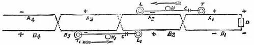 be connected by a long wire instead of through the sections of rail B2, B4, etc. This system requires that the sections shall all be of equal length, which is sometimes inconvenient, as when broad gorges have to be crossed, and at curved parts of the line. But this difficulty can be overcome to some extent by employing a "gravitation section" longer than the distance between the contact wheels of a train. This section is constructed with a downward slope, so that the weight of the train will propel it over the part in which it receives no electric energy.