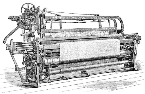 Remarkable success has attended the efforts to increase the speed of the power-loom. They are built to vary in speed from fifty-four to three hundred picks a minute, according to the fabric upon which they are employed. One hundred and fifteen picks a minute, for each one of which the shuttle travels one hundred and fifteen inches, is now accomplished in the weaving of fancy worsteds. This is not a single or simple motion, but a series, each dependent on the other. The power-loom, at one and the same time, forms the shed in the warp threads, as called for by the pattern or design, and, through the agency of few or many harnesses, propels the shuttles in consecutive order across the piece, beats the picks of weft into close compact, and winds the woven cloth on the piece-beam. Should the wet yarn break or run off the bobbin, or should the shuttles fail to reach home, the loom automatically stops itself. What more can human ingenuity do for the power-loom?