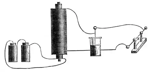 Galvanic Battery. | Ruhmkorff Induction-Coil. | Leyden Jar. | Electrodes and Spark. |