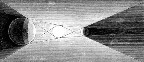 Actual sources of light are not, however, mere points; they have finite and variable dimensions, and this complicates the effect in the geometry of shadows. These effects are well illustrated by the diagram (Fig. 7). Let the central sphere represent a source of light placed between two opaque spheres, one larger and the other smaller than itself. We shall then have two kinds of shadow, the total shadow or umbra, and the partial shadow or penumbra. If the opaque sphere, seen at the right in the diagram, be smaller than the luminous body, the umbra terminates at a finite distance depending upon the relative magnitudes and the proximity of the two bodies. If the opaque body is larger than the source of illumination, as illustrated in the left portion of the diagram, the cone of the umbra is projected to an infinite distance. The penumbral cones represented