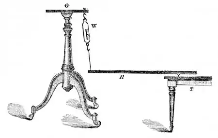 it better, which illustrates the principle of an apparatus used by Crookes. B is the strong mahogany board, several feet long, one end of which rests on the table, T, by means of a sharp point placed in the under side, while the other end is fastened to the balance, W, which hangs suspended from a rest, G. The index of the balance shows how great the weight is which it has to bear. Every movement backward or forward, any shaking or pushing which is communicated to the board, must be made perceptible through a rising or falling of the index. And now, Crookes assures us that he has perceived such motions of the index, in the presence of others, when Mr. Home, the principal medium, did not move the apparatus at all, but was held firmly by the bands and feet, some distance from it! And that is all! Crookes ventures his monstrous assertion on the ground that the balance made motions which appeared to have no cause whatever! Whoever is satisfied with the general assertions of Crookes, in this respect, manifests such incapability of judgment concerning science, that he has simply no right to speak about such things.