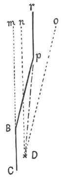 It is one of the elementary laws of physics that the center of gravity of a body must be over some point in its base in order that the body may stand without outside support. Now, the base on which a bicycle rests is only a line about half an inch wide, which joins the point B, in my figure, where the front wheel rests on the ground, with the point C, where the rear wheel rests. (I adopt Mr. Warring's lettering.) So long as a vertical line dropped from the center of gravity of the machine falls on some point of the line B C, the bicycle is in stable equilibrium; but, when it falls outside this narrow base, as at the point D, the equilibrium becomes unstable. In order to keep the machine and rider from coming to the ground, D must be brought upon B C; or, what is equivalent, B C must be brought under D. The latter is what is actually done. As the rider can not slide his machine sideways over the ground, he steers it obliquely toward the side on which he tends to fall. Thus, if the bicycle were running in the direction C m, he turns it toward the right so as to go in the direction B p. The center of gravity of the machine and its rider, which had been moving parallel to the course of the machine, is now acted on by two forces: (1) its acquired momentum, which tends to carry it on in the direction D n, and (2) the force constantly being received from the moving bicycle, which tends to carry it along the line D o, parallel to the new course of the machine. The result is, that it takes an intermediate direction, D p, in accordance with the law of the composition of forces. Thus, by being made to follow converging lines, D and B C are brought together at the point p. As quick as this is accomplished the bicycle must be turned again parallel to its original direction, or D will pass over to the left of B C and make the machine tilt toward that side. Hence, it is seen that righting a falling bicycle in motion involves two movements: first, a turn of the machine toward the side on which it tends to fall, then a return to its original course. Gravity was not mentioned among the forces considered above, but its action does not vitiate my explanation. I will add that I ride a bicycle myself, and so am acquainted with this matter on the practical as well as on the theoretical side.