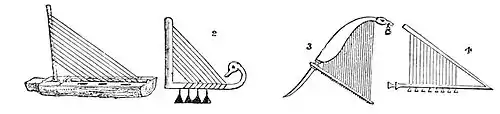 1 and 3. Portable Harps for single use. 2. Orchestral Harp. 4. From Painting at Thebes, on tomb of Rameses III.