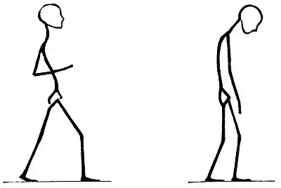 beyond the powers of many medical men. I have simply indicated the position by a few simple lines such as anyone can draw. This method is one which was employed with great success by the late Prof. Goodsir more than thirty years ago in illustrating his lectures on anatomy. In a few lines he conveyed the impression of the agility of the cat as compared with the heavy movements of the ox or of the elephant, and the absence of detail fixed the minds of his students all the more firmly on the main facts which he wished them to carry away. As we walk along the streets and notice the difference of attitude in the passers-by, some with head erect and agile steps convey to us at once the idea of energy and activity (Fig. 1), while others with hanging heads and bended knees suggest the ideas of languor, weakness, and depression (Fig.