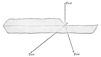 In the above figure, which represents an exaggerated picture of a layer of oil on the surface of a body of water, let Taw represent the superficial tension of the surface separating air from water; let Tao represent the superficial tension of the surface separating air from oil; let Tow represent the superficial tension of the surface