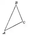 Fig. 6. separating oil from water; and let P be a point of the line forming the common intersection of the surfaces separating the air, oil, and water. For the equilibrium of these three media, the three tensions Taw, Tao, and Tow must be in equilibrium along the line of common intersection, and since these tensions have been measured and are known, the angles which their directions make with one another can be easily determined; for, by constructing a triangle, ABC, having sides proportional to these tensions, the exterior angles will be equal to the angles formed by the three surfaces of separation which meet in a line. But it is not always possible to construct a triangle with three given lines as its sides. If one of the lines is greater in length than the sum of the lengths of the other two, the triangle is impossible. For the same reason, if any one of the superficial