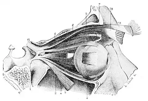 Fig. 1.—This figure gives a general view of the eyeball, the outer wall of the orbit being removed: 1, tendon of origin of three of the muscles of the eyeball; 2, the external straight muscle divided and turned down so as to expose the lower straight muscle; 3, 4, 5, 6,7, 8, muscles moving the eyeball; 9, 10, 10, muscle which raises the upper eyelid; 11, optic nerve. (After Sappey.)